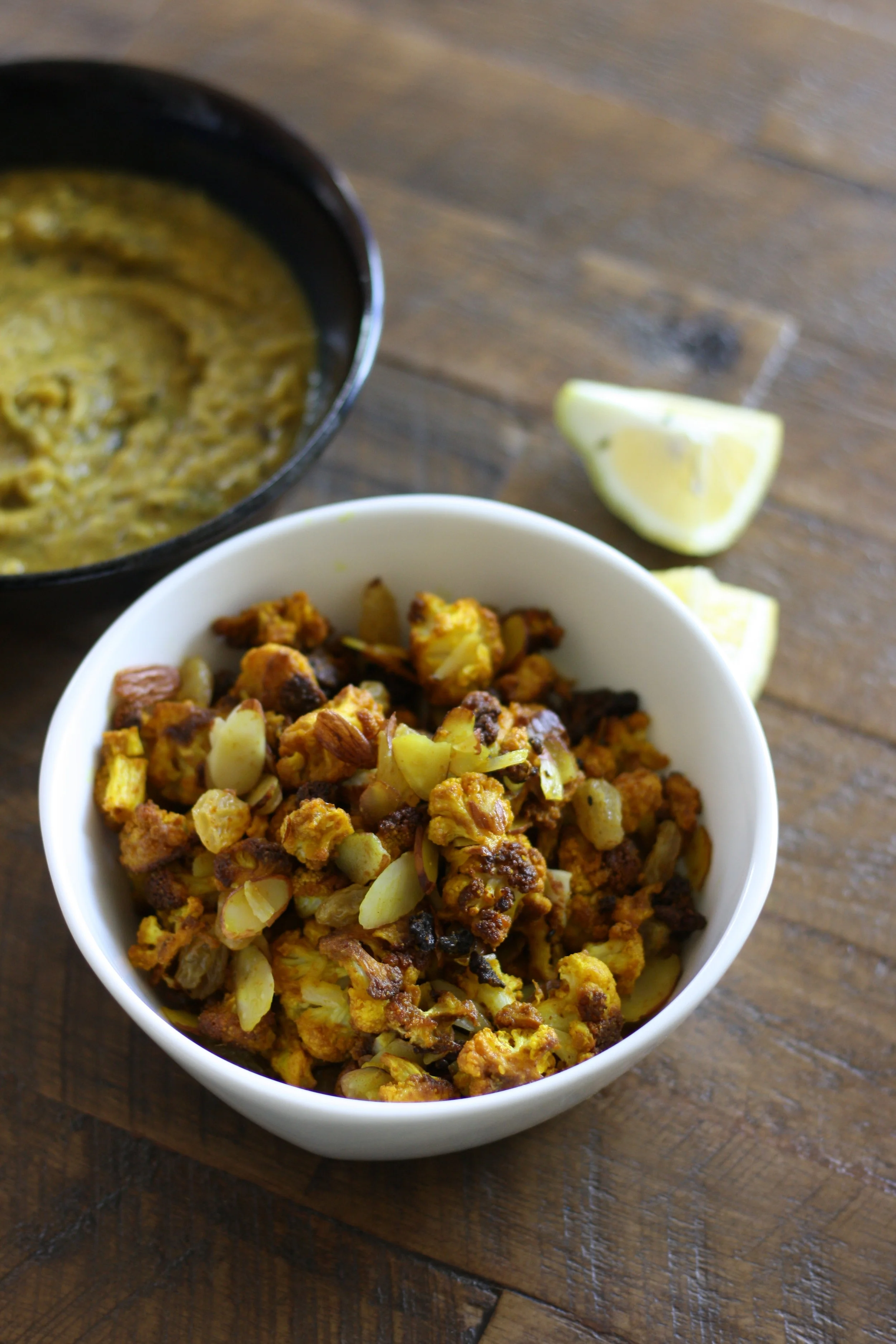 Photo (clockwise): Shorbat Addas, Turmeric Roasted Cauliflower with Shaved Almonds and Golden Raisins.